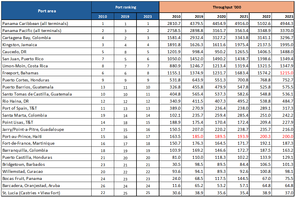 This brief note presents an analysis of the 25 largest container ports and terminals in the Caribbean, highlighting their throughput, changes in activity over the (selected) years and their role in transhipment.