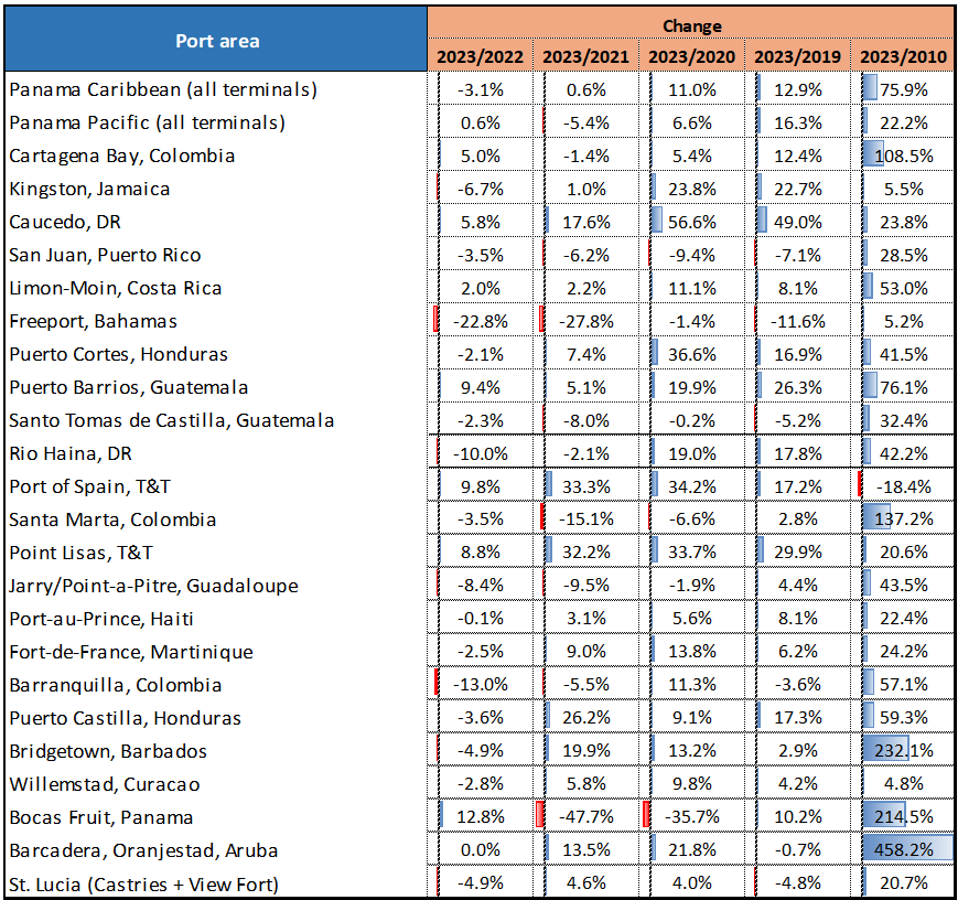 In the medium term, i.e. variations with respect to the pre-pandemic, Caucedo, Point Lisas, Puerto Barrios and Kingston stand out. In the short term, over the previous year, the cases of Bocas, the ports of Trinidad and Tobago, Puerto Barrios, Caucedo and Cartagena stand out. However, not all ports have shown recent growth. Freeport in the Bahamas has seen a 22.8% decrease compared to 2022, as well as Barranquilla and Rio Haina.