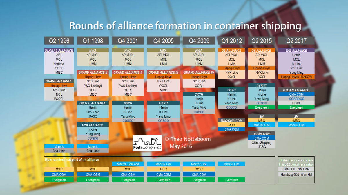 Today, four alliances are operational in the market: 2M, Ocean Three, CKYHE and G6. However, the recent merger of China Shipping and Cosco to form China Cosco Container Lines (COSCOCS) and the acquisition of APL/NOL by CMA CGM already signalled upcoming major changes in the current alliance structure. The new alliance landscape has become more clear in the past weeks. The 2M alliance will remain. Subject to regulatory approval, two new large-scale alliances will start operations in Q2 of 2017: Ocean Alliance and THE Alliance. There are still a few unknown factors though. First, Hapag-Lloyd and UASC are still in talks about far-reaching cooperation or even merger, so UASC might end up being part of THE Alliance. Second, Hyundai Merchant Marine (HMM) is a remarkable absentee in the latest round of alliance formation. Third, it remains to be seen whether some of the other top 20 carriers might eventually go for alliances (think of ZIM Line or Hamburg-Sued) or will rely more on ad hoc vessel-sharing agreements (VSA).