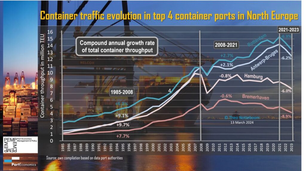 In a new PortGraph PortEconomics co-director Theo Notteboom presents the container traffic evolution (in TEU) in the ports of Rotterdam, Antwerp-Bruges (i.e., the sum of Antwerp and Zeebrugge before the 2022 merger), Hamburg, and Bremerhaven.