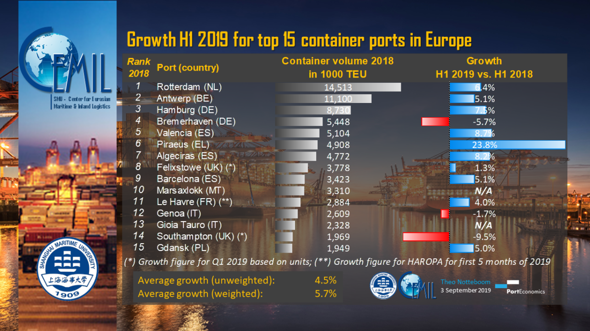 Second, Piraeus continues its strong growth path of the past decade by recording an impressive 23.8% growth in H1 2019 compared to H1 2018. If this growth figure can be sustained throughout 2019, the Greek hub port will reach about 6 million TEU this year and climb to the fourth position in the European ranking. Note that Piraeus only handled 1.2 million TEU in 2010. Also Spanish ports Valencia, Algeciras and Barcelona remain on an upward growth curve. Barcelona was hit very hard in 2009 and had difficulties in regaining growth afterwards. However, the year 2017 brought a trend break in the Catalonian port and also last year the port recorded strong growth. Genoa presented impressive growth figures in 2017 (+14.1%), but Italy’s largest container port has difficulties to match the 2017 volume (-0.5% in 2018 and -1.7% in H1 2019).
