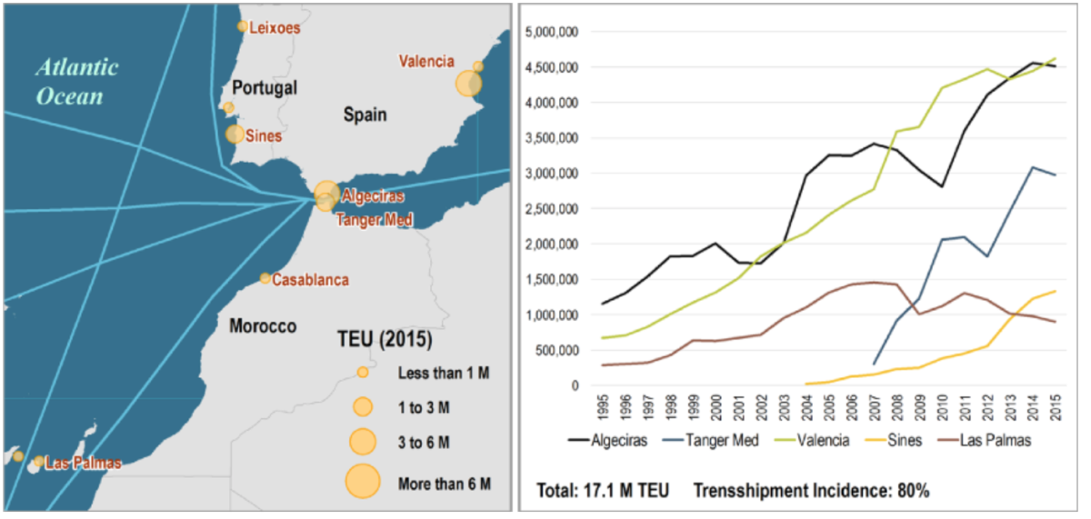 The Strait of Gibraltar is a natural bottleneck at the junction of Mediterranean, North Atlantic and West African shipping routes. The growth of the Europe / Asia trade has led to the increasing use of the strait for transshipment. Most of this transshipment takes the form of a dual competition between the established hub of Algeciras (on the Spanish side of the strait) and the new hub of Tanger Med (on the Moroccan side). When it opened in the late 2000s, Tanger Med saw the relocation of some of the transshipment activities taking place in Algeciras, but both hubs resumed their growth afterwards, a trend that appears to be leveling off. Both are pure transshipment hubs since more than 90% of their volume concerns transshipment cargoes that do not leave the port. Valencia has also been an active transshipment hub in spite of involving a higher level of deviation from the main shipping lanes since it provides hinterland cargoes as well. The port of Sines in Portugal is also vying for a share of the transshipment business and recently overtook Las Palmas that has been a transshipment hub focusing on the West African trade, a role that has been eroded by Tanger Med.