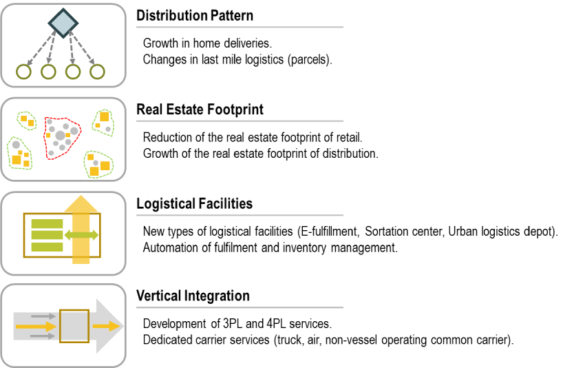 • Distribution Pattern. The growth in home deliveries is one of the most tangible impacts of e-commerce as consumers are switching a growing share of their consumption (particularly discretionary) to purchases made online. Instead of a retail consumption pattern involving consumers going to stores and carry back home their purchases, with e-commerce most of these purchases are delivered through parcel services. This is changing the scale of last mile logistics with the growing role of parcel deliveries and strategies to insure that these parcels reach their consignees.
